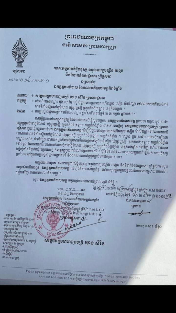 យោងលើឯកសារពាក្យស្នើសុំលេខ០១៤រស.គ១ចុះថ្ងៃទី១០ ខែសីហា ឆ្នាំ២០២១របស់គណកម្មាធិកាសិទ្ធមនុស្សទទួលពាក្យបណ្តឹងអង្កេតទំនាក់ទំនងព្រឹទ្ធសភានៃព្ររាជាណាចក្រកម្ពុជា